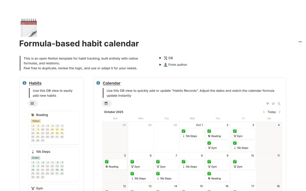 This open-source template is a powerful habit tracker built entirely in Notion using native formulas, relations, and rollups. It features a visual calendar that updates dynamically as you add or modify your habit records, helping you to see your progress.